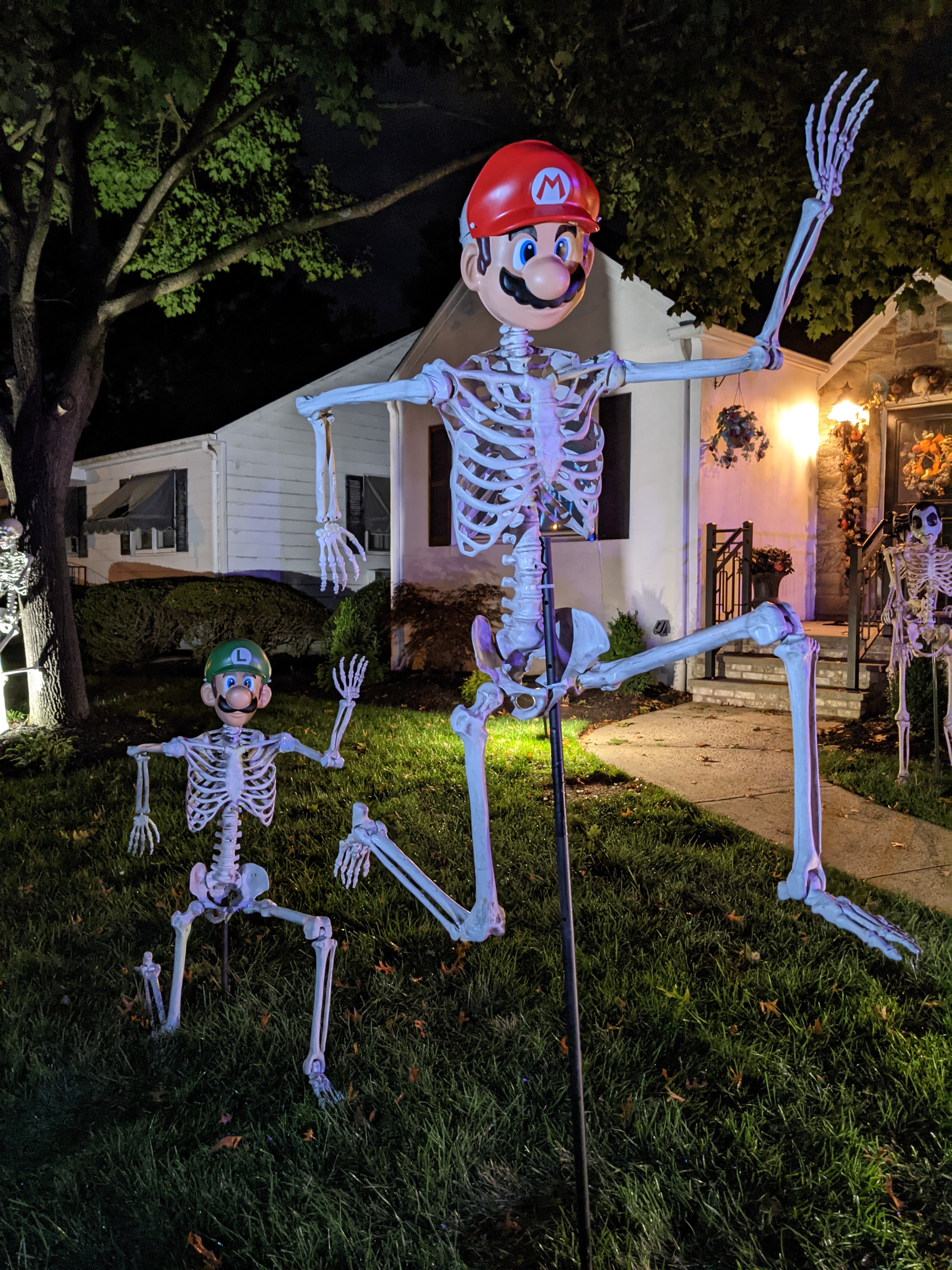 October 12th, 2021 – Mario & Luigi… The Super Mario Brothers… Jumping skeletons to new heights… #31skeletons #theskeletonhouse #legrandmasquerade #supermariobros